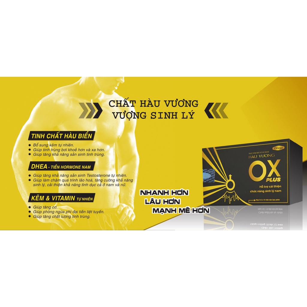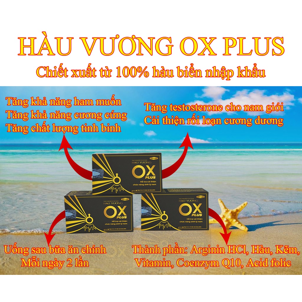 + Sản phẩm Hàu Vương OX PLUS với chiết xuất từ 100% hàu biển nhập khẩu giúp bổ sung kẽm và những chất cần thiết giúp kích thích sản xuất testosterone & tăng ham muốn ở nam giới, tăng chất lương tinh trùng, duy trì thời gian bền bỉ.
