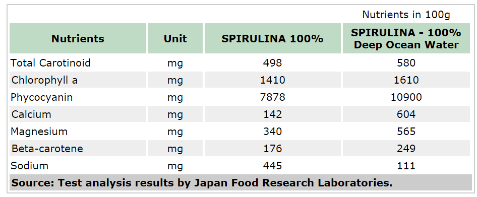 Tảo biển spirulina với lượng chất đạm không dưới 70% là nguồn chất đạm, nhiều gấp 3 lần thịt bò (20-25%), hơn xa thịt gia cầm (22-30%), và vượt xa sữa tươi (3-4%). Đạm trong tảo biển spirulina cung cấp hơn 20 loại acid amin cho cơ thể. Ngoài ra, Spirulina bổ sung các loại sinh tố thuộc nhóm kháng ung thư như Vitamin A và Vitamin E, đều có hàm lượng vitamin nhiều hơn hẳn các thực phẩm tự nhiên khác. Đặc biệt là sự hiện diện của tập thể sinh tố B1, B2, B6, B12, PP… trong tảo xoắn giúp cho các acid amin trong tảo được hấp thụ tối đa. Tảo xoắn còn cung cấp các khoáng như CaCO3, Mg, P, K, Fe, Zn, Se, Cr, molybdan… cho cơ thể.